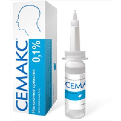 Pharmacodynamics. Semax nasal drops 0.1% has an original mechanism neurospecific action on the central nervous system (CNS). Semax nasal drops 0.1% synthetic analogue of corticotrophin possessing nootropic properties, and completely devoid of hormonal activity. The drug affects the processes associated with memory formation and learning. Semax nasal drops 0.1% enhances attention in training and analysis of information, improves the consolidation of the memory trace, improves adaptation to hypoxia, cerebral ischemia, anesthesia and other damaging influences. The drug is practically non-toxic in single and prolonged administration. Shows no allergic, embryotoxic, teratogenic and mutagenic properties. Has no local irritating action.
