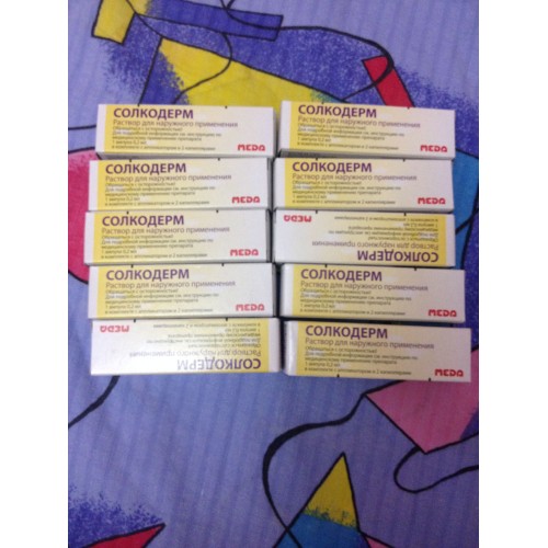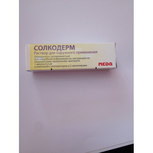 Pharmacological properties: combined preparation for external use only. After applying to the affected area gets into the treated tissue and after 1-2 min causes a change in its color, which reflects the in vivo fixation of tissues treated area. In what is mummification of pathological tissue, dark crust and a few days alone eliminated. Healing occurs quickly. Complications (in the form of a secondary infection or scarring) are rare. Development of systemic effects unlikely. Indications: Local treatment of superficial benign skin lesions, including common and plantar warts, genital warts, seborrheic keratosis, nevus (with confirmed benign process). APPLICATION: treatment should be a doctor or trained medical personnel. Due to instability of p-pa in an open vial for each application you must use a new vial. Open vial can be fixed in a special recess in the package. Before the procedure affected skin is treated with alcohol or ether. Solcoderm applied directly to exposed skin. For applying the product in each package is the applicator with a sharp and blunt ends and a glass tube. The sharp end of the applicator is designed to handle minor injuries in the area, the blunt end is designed to handle large and / or cornified lesions. With the glass tube can handle the surface area of 4-5 cm2. Adults and children Solcoderm carefully applied to the affected area with applicator or glass tube, and then penetrating the plastic applicator to complete absorption of p-pa. Over the next 3-5 minutes to draw attention to the appearance of grayish or yellowish color of treated skin. If necessary, the procedure should be repeated until the specified color. Affected area near the eyes and mucous membranes should be handled with extreme caution. When processing keratinized warts of the stratum corneum can be removed first. Neoplasms with a diameter of 10 mm was treated Solcoderm only if struck by a top layer of skin. With multiple lesions treated drug should be carried out in several stages with an interval of about 4 weeks. During one session can be processed 04.05 skin lesions with a total area no more than 4-5 cm2. Within a few days after treatment the affected area is covered mummified dark brown crust. When poor mummification process can be repeated several days later. CONTRAINDICATIONS: malignant skin tumors prone to metastasis (melanoma), freckles, keloid scars. SIDE EFFECTS: The feeling of light short local burning. With severe reactions in the adjacent areas of skin can be applied a cream containing corticosteroids or ointment containing anesthetics. In the case of treatment of deep skin lesions after cauterization of the drug may remain depigmented spots or scars. SPECIAL INSTRUCTIONS: for the normal flow of the process of mummification neoplasm, which occurred at Solcoderm should be handled in 70% alcohol, especially after a bath / shower. Eschar can not be removed, it should disappear on their own. Until complete healing should avoid direct exposure to sunlight and UV irradiation. If the product enters the mucous membranes or healthy skin it is necessary to quickly rinse with plenty of water or 1% p-rum sodium bicarbonate. When surgical removal of the affected area of skin prior to application Solcoderm, treatment should begin no earlier than 8-10 days. Patients with a tendency toward the formation of rough scars appoint Solcoderm should not be. Treatment Solcoderm during pregnancy is carried out only in cases where the benefits to the mother outweigh the risks to the fetus. Before you throw away the used vial, the remnants of a p-pa should be washed off with running water. INTERACTION: not described. OVERDOSE: ulcer formed in overdose, is subject to the standard local treatment. Storage conditions: temperature 8-20 ° C.