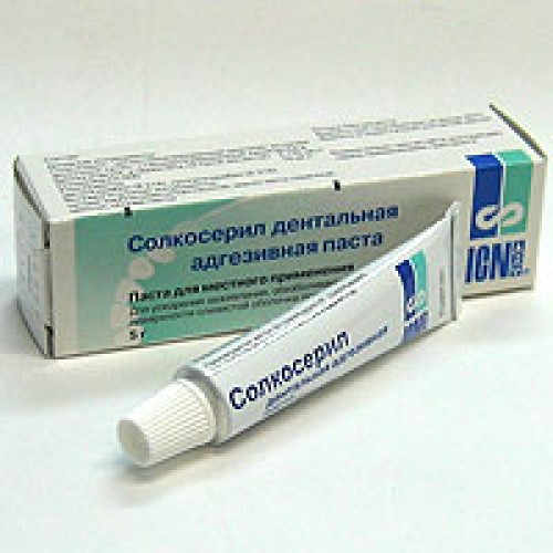Contains a wide range of natural low molecular weight substances 10,000 daltons (glycolipids, nucleotides ¬ zidy and nucleotides, amino acids, oligopeptides, minerals, electrolytes and intermediate products of carbohydrate and fat metabolism). Activates the transport of oxygen and nutrients to cells and promotes their recovery, increases the consumption of oxygen by cells, stimulates the synthesis of ATP, enhances the proliferation of reversibly damaged cells, particularly in hypoxic conditions, thereby expediting the healing process. Strengthens the intracellular energy transfer and increases stockpiles phosphates. Stimulates the regeneration of tissue, promotes revascularization of ischemic tissues, and also creates conditions conducive to the synthesis of collagen and formation of granulation tissue, accelerates reepitalizatsiyu and wound healing. Solkoseril ¬ membrane has a stabilizing and cytoprotective effect. Local anesthetic polidokanol provides rapid and prolonged analgesic action. Paste sticks to the mucous membrane, forming a protective film that protects it from damaging influences.